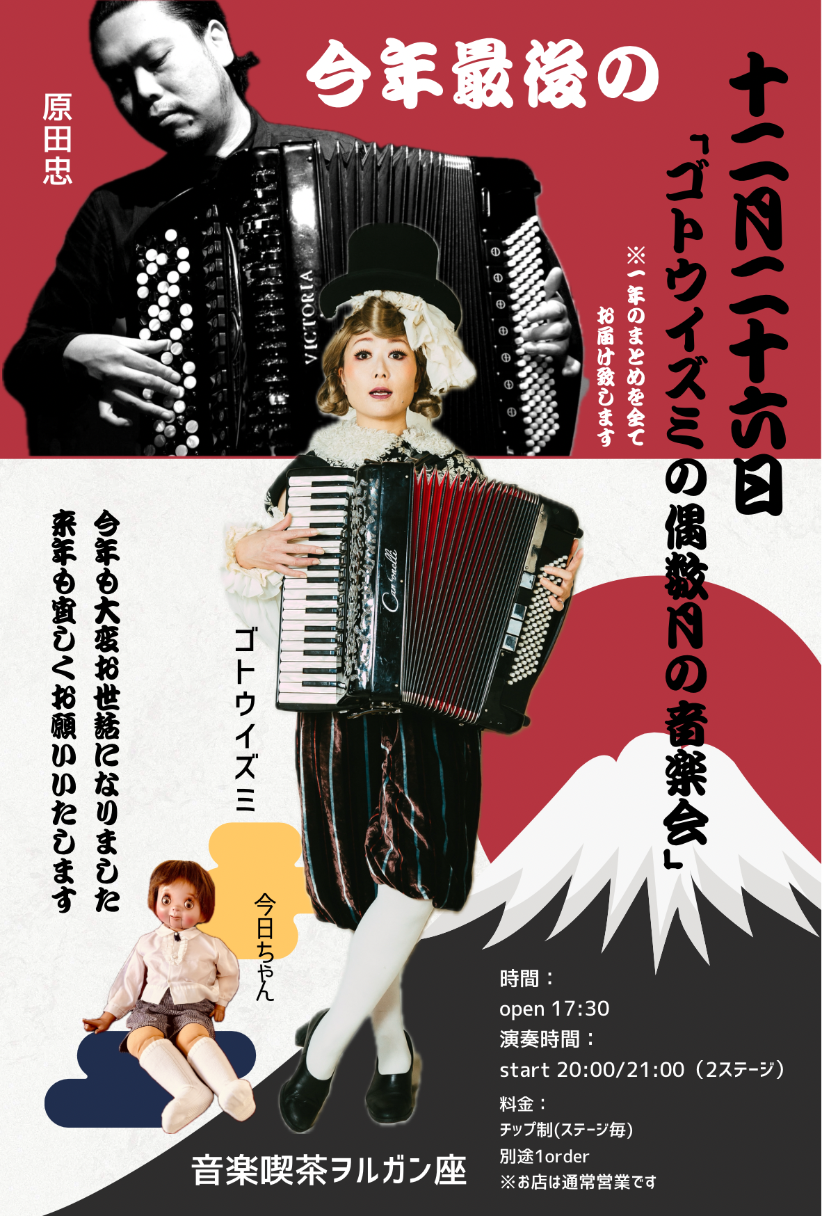 毎年有難い恒例の、ヲルガン座アコーディオン部部長原田忠さんと、年末感溢れる演奏会と演芸会を投げ銭で開催します。